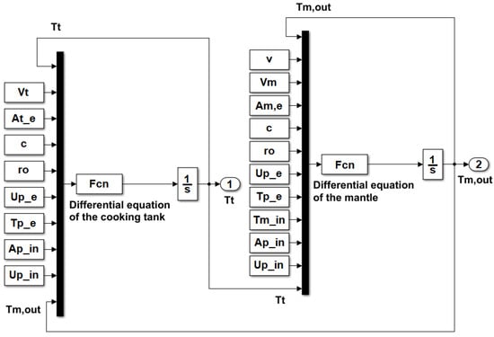 Equations (1) and (2) were fed into the Matlab/Simulink programming environment. The computer realization of the model can be seen in Figure 4.