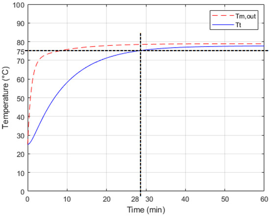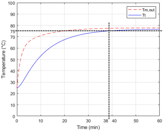 is assumed to be constant as the solar pot is located in an air-conditioned mobile container, so , in accordance with the temperature set inside the container. The initial values of the model are also set to this value, so and . (Accordingly, our model can be applied for a solar pot inside a building, which is a rather general situation, since the outside effects, like the effect of sky, solar irradiance, wind speed etc. are not considered.) For the sake of simplicity, is set constant in the simulations, 80 °C. Choosing this temperature value, it was taken into consideration that it can easily be reached and maintained for a longer time on a typical day in May in Hungary and that this inlet temperature is probably high enough for the cooking tank to reach the minimum temperature for sterilizing foods—based on our preliminary assumption. This minimum temperature is 73.9 °C, but in this work 75 °C is aimed due to safety purposes. The simulations were carried out with two different volumetric flow rate () values, which can be realized in the experimental system as well. The results of the simulations are presented in Figure 5 and Figure 6. More specifically, Figure 5 presents the modelled and temperatures in case of , while Figure 6 presents them in case of . The running time of the simulations was 1 h in both cases.
