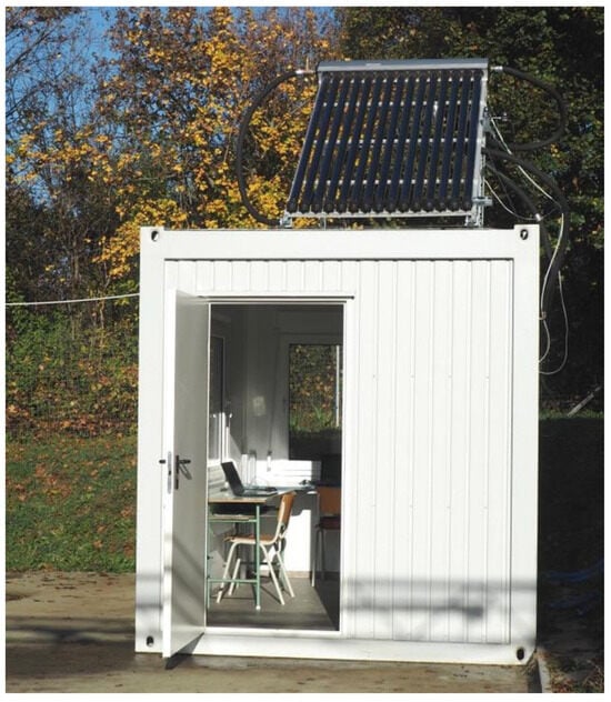 The pipes connecting the solar pot and the collector are insulated and their volume is neglected. As a result, we consider the mantle inlet water temperature and the solar collector outlet water temperature equal . The same goes for the mantle outlet water temperature and the solar collector inlet water temperature . The structure of the experimental system, installed at the campus of the Hungarian University of Agriculture and Life Sciences (Gödöllő, Hungary), is shown in Figure 3, the physically manufactured solar pot is presented in Figure 1 and the connected evacuated tube solar collector can be seen in Figure 7.