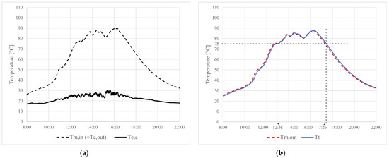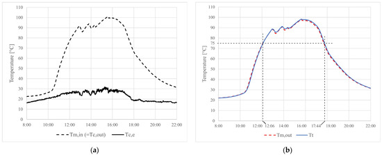 Figure 9, Figure 11, Figure 13 and Figure 15 demonstrate that the cooking tank temperature reached the safe cooking temperature of 75 °C during the measurements in the early afternoon, between 12:00 and 13:00. The temperature of the cooking tank was higher than this value until late afternoon, between 17:20 and 18:00. The only exception was on 30 May when the tank temperature decreased below 75 °C at 16:18 due to the cloudier weather than usual. According to the measurements, it can be stated that the volumetric flow rate has no considerable influence on the heating. Both examined flow rate values made the safe cooking possible for a satisfactory time interval within each measured day. The measured values of and are almost equal, which is in accordance with the final modelled temperature values in the simulations (see Figure 5 and Figure 6).