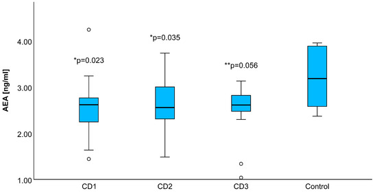 The serum concentration of AEA in the study group before treatment was 2.63 [2.24; 2.79] ng/mL, similar during the treatment 2.56 [2.33; 3.06] ng/mL, and in the remission-2.61 [2.46; 2.85] ng/mL. As illustrated in Figure 1, all AEA mean concentrations in the CD group were lower as compared to values observed in the control group—3.18 [2.57; 3.88] ng/mL. The results between the CD groups in every phase and the control group were statistically significant (CD1 vs. C p = 0.023, CD2 vs. C p = 0.035, CD3 vs. C p = 0.056 (at the border line of statistical significance)).