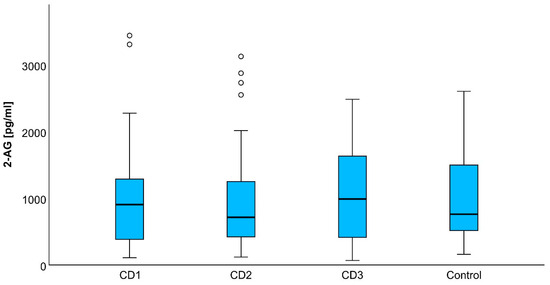 The concentrations of 2-AG in the study group were stable—acute phase (CD1) 907.4 [379.3; 1300.5] pg/mL, during the treatment (CD2) 715.1 [416.7; 1302.5] pg/mL, remission (CD3) 991.1 [381.1; 1652.5] pg/mL, and similar to the values observed in the control group 761.8 [504.3; 1497.0] pg/mL (Figure 2). There were no significant differences between the results obtained at all examined time points in the study group and in comparison to the results in the control group (p > 0.44 in all cases).
