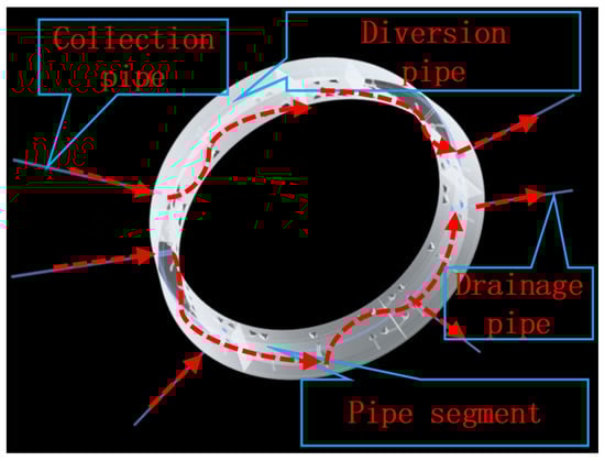 To solve issues such as the destruction of groundwater transport channels due to the barrier effect of shield tunneling, the accumulation of upstream water, and the increase in water pressure difference on both sides of the tunnel, a novel pipe segment with a diversion function has been designed. The guide function pipe segment mainly consists of pipe segments, diversion pipes, and distribution pipes. The diversion pipes are pre-embedded inside the concrete pipe segments, and they are used to connect the collection pipes with the distribution pipes. The collection and distribution pipes are used to divert water from one side of the pipe segment to the other. The diversion pipe and distribution pipes form a transportation channel for water, as shown in Figure 2.