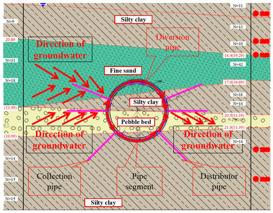 Groundwater can flow into the pipe segments through the collection pipe, and then to the ground via the opposite side’s collection pipe, repairing the flow function of groundwater obstructed by the shield-laid pipe segments. The flow of groundwater is supplemented, and the water pressure difference on both sides of the tunnel is reduced, protecting the aquifer system and the ecological environment of groundwater, alleviating unsymmetrical pressure on the pipe segments, as shown in Figure 3.