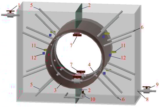 In Figure 4, the water injection and pressure hole (1) is located on the upper middle position of the left sidewall of the test box, with a diameter of 20 mm, mainly used for injecting water and increasing pressure. The upper and lower glass partitions (2) are used to simulate the impervious layers. The iron rings (3) simulate the pipe segments of the tunnel, plastic soft tubes 4 simulate the diversion pipe, arranged in a ring shape within the iron ring, simulating a 20 mm diameter hole reserved on the pipe segments. The collection pipe (5) and drainage pipe (6) pass through the reserved holes, distributed on both sides of the glass partition, connected to the diversion pipe with three-way connections, and the diversion pipe is equipped with upper and lower switches (7) to control the flow rate of the diversion flow. The blowoff hole (8) is located at the lower middle position of the right sidewall of the test box, with a diameter of 20 mm. The switch (9) is installed at the blowoff hole, controlling the flow speed of the water from the blowoff hole, and the drainage hole (10) is located on the front sidewall of the test box, one on each side, symmetrically distributed, with a diameter of 20 mm, mainly used for draining water during the experiment.