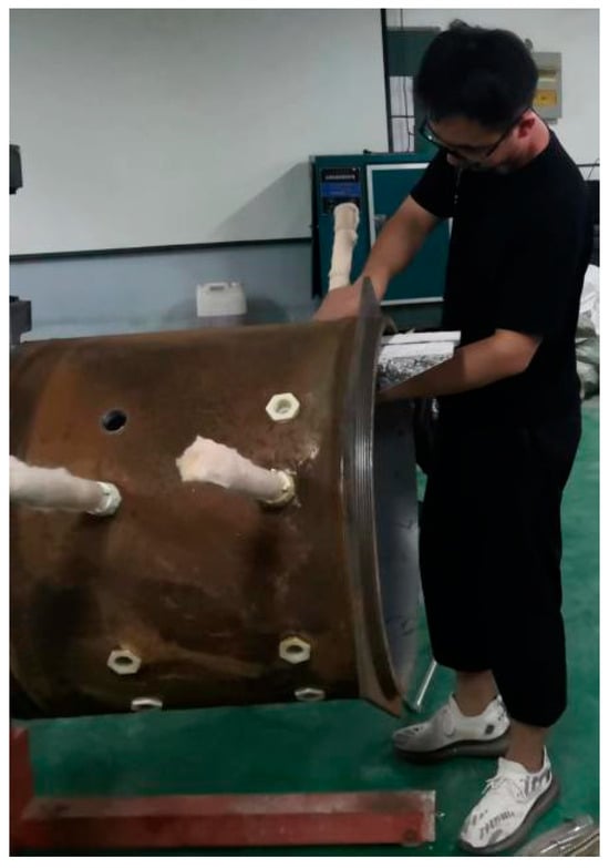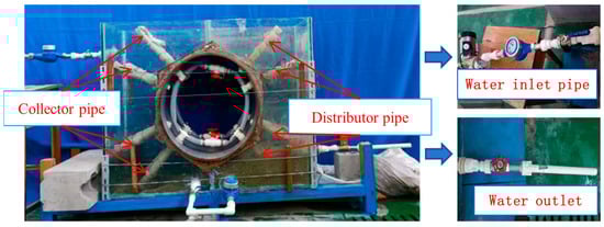 The simulated pipe segment are made from 630 mm diameter, 700 mm long, and 10 mm thick iron rings. Holes with a diameter of 20 mm are punched at the designed intervals on the iron rings. The collection and dispersal pipes are made from PPR (Polypropylene Random) pipes with a diameter of 20 mm and a wall thickness of 2.5 mm. Each collection or dispersal pipe is 32 cm long, and 20 mm diameter holes at 3 cm intervals are cross-drilled to create a perforated tube, ensuring that water can flow from the collection pipe into the diversion pipe, and finally exit from the dispersal pipe. The connection between the collection and dispersal pipes and the sealing plastic fittings is made using hot fusion, as shown in Figure 5. A layer of filter cloth is wrapped around the outside of the collection and dispersal pipes and fixed with rubber bands to prevent soil from entering the diversion function pipe and blocking the flow of water. The completed collection and dispersal pipes are installed in the designated holes of the pipe segments, as shown in Figure 6.