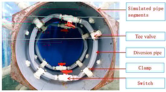 The diversion pipe is made of transparent plastic hose with easily stretchable ends for convenient connection, with a diameter of 25 mm and a wall thickness of 2.5 mm. It is connected to the plastic fittings through a tee joint. The diversion pipe, tee, and flow control valve connection are all secured with clamps, as shown in Figure 7. All the connections are sealed properly to prevent any leakage.