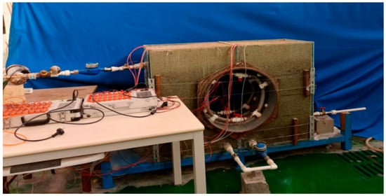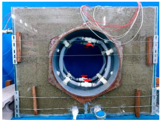Before filling the model box with sand and introducing water, strain gauges are pasted on the inner side of the pipe segment, and the strain gauge lead wire is connected to the static strain collection instrument. Upon the completion of the sand filling and model box construction, live data from the acquisition instrument are immediately captured at this instant, which are considered the initial strain values for the pipe segment. The test box for the diversion function pipe model is shown in Figure 12.