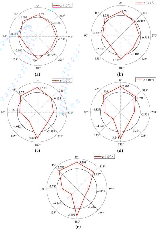 From Figure 13a–e, it is evident that under the different pressures applied to both the sides of the pipe segment, the strain distribution is not uniform. Compressive strains are observed at the top, left upper, and bottom of the segments, while tensile strains are present on the inner side, indicating a tendency to bulge outwards. The maximum compressive strain occurs at the bottom, with a significant value also found at the top. The tensile strain is greatest at the lower left and right sides, where the segment shows a tendency to concave inward. The strain values on the left side of the segment are greater than those on the right, but the difference is relatively small. The tensile strain on the upper right side decreases as the pressure difference increases, and even becomes compressive at 1.5 kPa before increasing again with further increases in the pressure difference. This phenomenon occurs because within the model test box, the pipe segments are mainly subjected to unsymmetrical pressure from the sand and water on both the sides. The sand and water compress the segments from both the left and right, causing the top and bottom to experience compressive forces and a tendency to bulge outward. Additionally, the left and right sides of the segments are pulled inward, resulting in a concave shape. The left and right lower sides experience greater pressure from the sand and water than the upper parts, leading to slightly higher strain values in these locations compared to those in the other areas where tension is experienced.