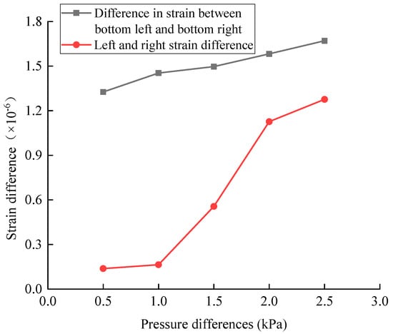 Figure 14 summarizes the correlation between the strain differences on the left and right sides, as well as the left down and right down areas, with the pressure difference.
