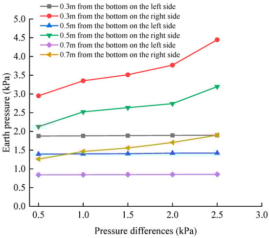 The distribution and variation in earth pressure around the pipe segment on both the sides change with the alteration in pressure difference, as depicted in Figure 15. On the left side, at distances of 0.3 m, 0.5 m, and 0.7 m from the bottom, the earth pressure around the pipe segment increases with the rise in pressure difference. The earth pressure increases by 1%, 2.2%, and 1.6%, respectively, as the pressure difference grows from 0.5 kPa to 2.5 kPa, indicating a minimal increase in left side earth pressure. Similarly, on the right side, at distances of 0.3 m, 0.5 m, and 0.7 m from the bottom, the earth pressure around the pipe segment also increases with the increase in pressure difference. The earth pressure increases significantly by 50.7%, 50.3%, and 50.3%, respectively, within the same pressure difference range. Moreover, under the same pressure difference, the earth pressure value at a distance of 0.3 m from the bottom on the right side is consistently higher than those at the other five positions.