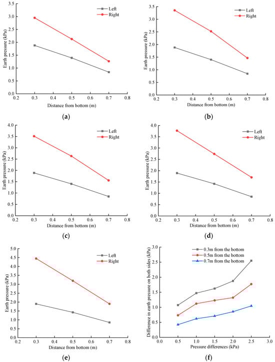 Variation in earth pressure. (a) Pressure difference 0.5 kPa. (b) Pressure difference 1.0 kPa. (c) Pressure difference 1.5 kPa. (d) Pressure difference 2.0 kPa. (e) Pressure difference 2.5 kPa. (f) Changes in earth pressure difference on both sides of pipe segments.