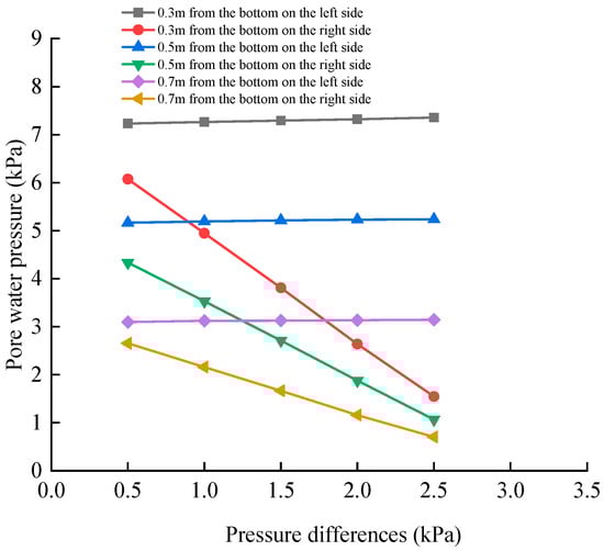 As illustrated in Figure 17, when the pressure differential is identical, the pore water pressure value at a depth of 0.3 m from the bottom on the left side is greater than the pore water pressure values at the other five measurement points. The pore water pressure around the pipe segment at 0.3 m, 0.5 m and 0.7 m from the bottom on the left side decreases with the increase in pressure difference between the two sides. When the pressure difference is increased from 0.5 kPa to 2.5 kPa, the pore water pressure decreases by 1.7%, 1.4%, and 1.5%, respectively. It can be observed that the pore water pressure loss on the left side is smaller. The pore water pressure around the pipe segment at 0.3 m, 0.5 m and 0.7 m from the bottom on the right side also decreased with the increase in pressure difference between the two sides. When the pressure difference increased from 0.5 kPa to 2.5 kPa, the pore water pressure decreased by 74.6%, 75.4% and 73.5%, respectively. The pore pressure loss on the right side was larger.