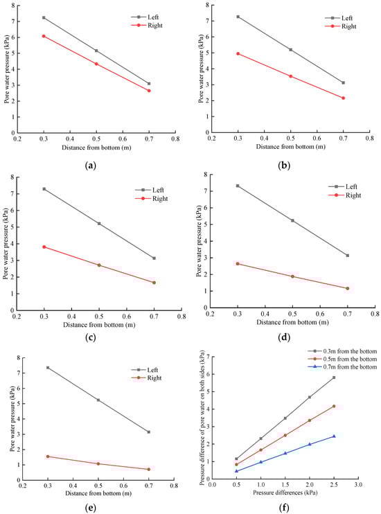Variation in pore pressure. (a) Pressure difference 0.5 kPa. (b) Pressure difference 1.0 kPa. (c) Pressure difference 1.5 kPa. (d) Pressure difference 2.0 kPa. (e) Pressure difference 2.5 kPa. (f) Changes in pore pressure difference on both sides of pipe segments at different depths.
