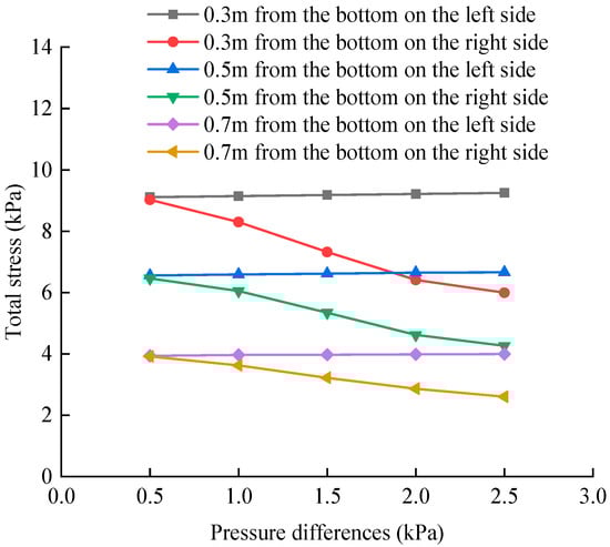 The quantitative analysis of the change in total stress at each measurement point as a function of the pressure difference between the two sides of the pipe segment is required. Figure 19 illustrates that as the differential pressure rises from 0.5 kPa to 2.5 kPa, the total stresses on the left side of the pipe segment at 0.3 m, 0.5 m, and 0.7 m from the bottom increase by 1.5%, 1.6%, and 1.5%, respectively. Notably, the increase in the total stress on the left side of the pipe segment is comparatively less pronounced. The total stress around the pipe segment at 0.3 m, 0.5 m, and 0.7 m from the bottom on the right side decreases with the increase in differential pressure. The total stress decreases by 33.6%, 34%, and 33.5%, respectively. The change in the total stress on the right side of the pipe segment is more affected by the increase in differential pressure.