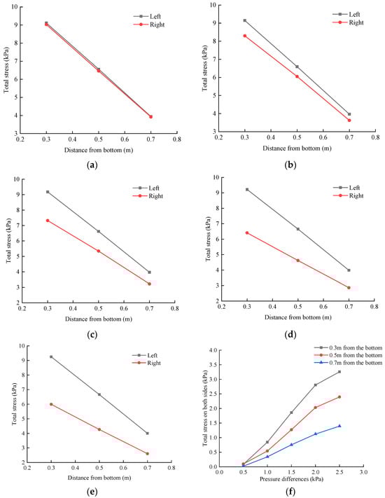 Variation in total stress. (a) Pressure difference 0.5 kPa. (b) Pressure difference 1.0 kPa. (c) Pressure difference 1.5 kPa. (d) Pressure difference 2.0 kPa. (e) Pressure difference 2.5 kPa. (f) Changes in total stress difference on both sides of pipe segments at different depths.