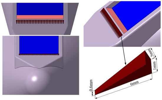 As previously mentioned, the key aspect in suppressing the aero-optical effect lies in mitigating density pulsations. Currently, there are two primary approaches: one involves reducing the intensity of density pulsations through cooling; and the other aims to disintegrate large-scale vortex structures into smaller ones via flow control, thereby diminishing the intensity of density pulsations [21]. In this study, we will investigate the corrective impact of the latter method on aero-optical effects. The model employed remains based on the THAAD-like seeker model described above, with a series of MVGs positioned 4 mm upstream from the window, as depicted in Figure 3. The dimensions of the MVGs are indicated in Figure 3, with a spacing of 1 mm between adjacent MVGs, as denoted in the lower right corner.