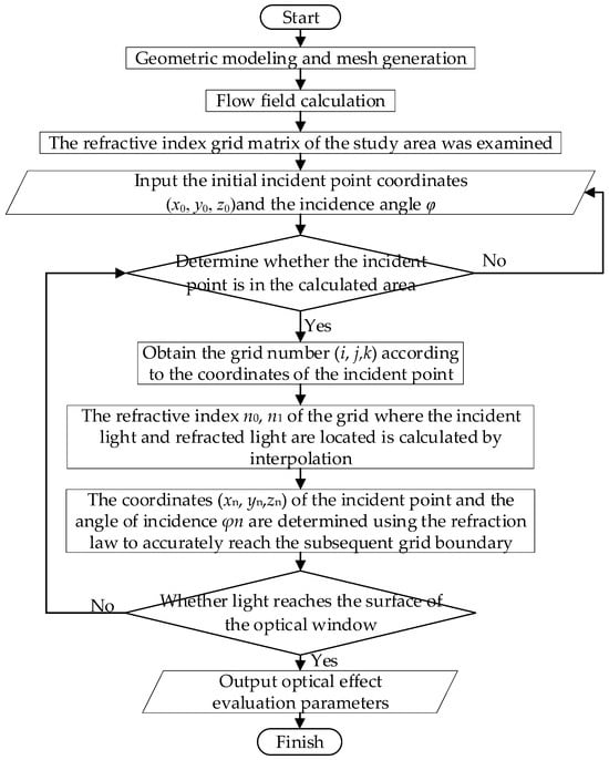 The optical transmission performance in this study is primarily assessed based on the flowchart depicted in Figure 5 below. Initially, a model similar to THAAD is created and meshed, followed by precise calculation of its flow field. Once the fine outflow field is obtained, the aero-optical program accesses the grid refractive index matrix of the study area. By inputting the coordinates of the initial incident point and incident angle, the principal program of geometric optics determines whether or not the incident point falls within the calculation area and calculates its corresponding grid number based on its coordinates. Interpolation is then used to calculate refractive indices (n0 and n1) at both incident light and refracted light locations within their respective grids, while applying refraction law to determine if light reaches the surface of an optical window by crossing into another grid boundary. If it fails to reach said surface, the tracing process for the aforementioned light will be repeated accordingly. Finally, once it does reach said surface, the tracing process concludes with outputting the evaluation parameters pertaining to aero-optical effects. A detailed introduction to the evaluation parameters for aero-optical effect assessment, as well as the flow field calculation method are provided below.