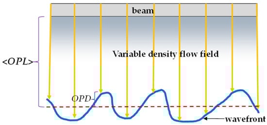 The ray passing through the nonuniform flow field forms the distorted wavefront, <OPL>, and OPD.