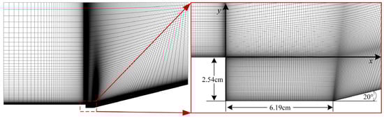 Although the geometric model of the step compression corner after supersonic flow is straightforward, the flow structure of separation and reattachment exhibits significant similarities with the flow field structure outside the window of future hypersonic seekers. As a numerical example, Settles’s [28] cavity compression corner model is selected as an experimental reference to verify the accuracy of the turbulence model and align with the flow problem studied in this paper. The step height h = 2.54 cm, the rear wall length l = 6.19 cm, and the compression corner angle θ = 20°. The mesh generated by the pointwise and geometric parameters is illustrated in Figure 8 below.