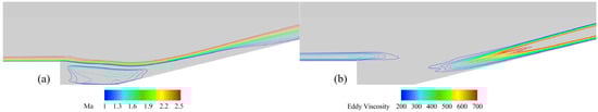 (a) Iso-contours of time averaged Ma and (b) time averaged eddy viscosity.