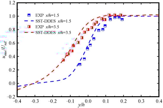 It can be observed that at the x/h = 1.5 station, the position is situated within the cavity of the specimen, resulting in a complex flow structure. The velocity results obtained from the numerical simulation exhibit excellent agreement with the experimental values. At the x/h = 3.5 location, it is positioned on the wall of the compression corner, behind the cavity. In comparison to the flow inside the cavity, the flow structure here appears relatively simpler; however, the calculated values slightly exceed the test values at y/h = 0~0.5 range. To summarize, employing the SST-DDES method yields satisfactory RMS speed outcomes, and thus this this method can be used to study the problem in this paper.