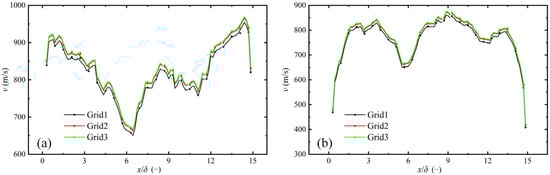 The flow velocity profiles of three meshes were compared at (a) y/δ = 18.75 and (b) y/δ = 43.75.