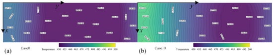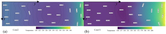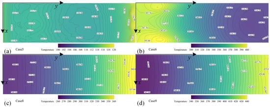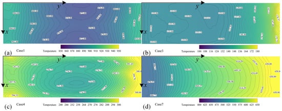 Subsequently, the impact of different jet angles and flow rates on the reduction of window temperature is compared under decreased inlet pressure conditions, as depicted in Figure 14 below. Figure 14a illustrates the temperature distribution across the window when a jet flow rate of 0.05 kg/s is employed at Mach 5 flight speed and an altitude of 30 km. The figure clearly demonstrates a significant cooling effect on the window, with minimal temperature fluctuations, which can be attributed to reduced total pressure resulting in diminished external interference from cooling gas and facilitating efficient heat absorption near the window surface. In Figure 14b, where a perpendicular jet mode is utilized, it becomes evident that temperatures near the rear step are higher, due to vertical jets disrupting the normal free flow and causing increased separation zones, along with larger return regions at the back step, consequently leading to elevated temperatures. Excessive cooling gas carried downstream by free flow enhances cooling effectiveness for downstream windows compared to upstream positions. The temperature distribution of the window gradually increases in Figure 14c,d as the jet flows decrease, while still maintaining directionality towards flow progression. In summary, both jet modes improve the wall temperatures of windows compared to back-step flow fields without jets. Among them, tangentially parallel window jet cooling exhibits superior performance over vertical axis jet cooling.