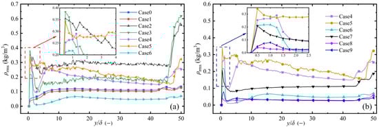 ρrms distribution in flow direction under different flow field conditions: (a) Case0 to Case6; (b) Case4 to Case9.