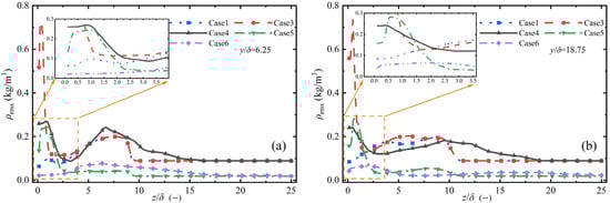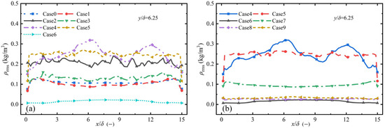 ρrms distribution in longitudinal direction under different flow field conditions: (a) y/δ = 6.25; (b) y/δ = 18.75.