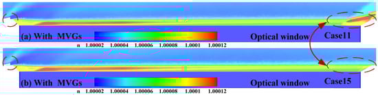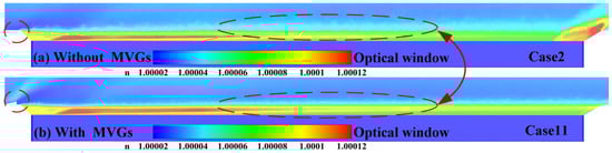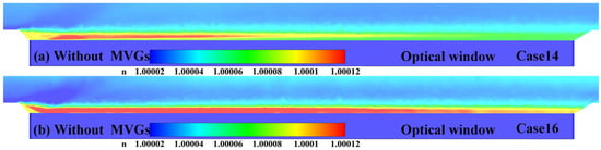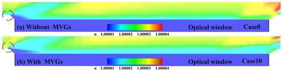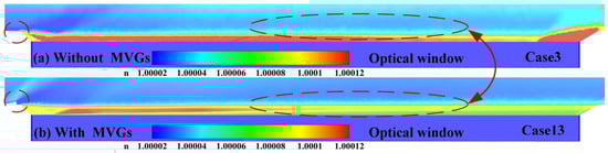 Comparison of refractive index distribution near the optical window under Ma = 3: (a) without suction, (b) with suction.
