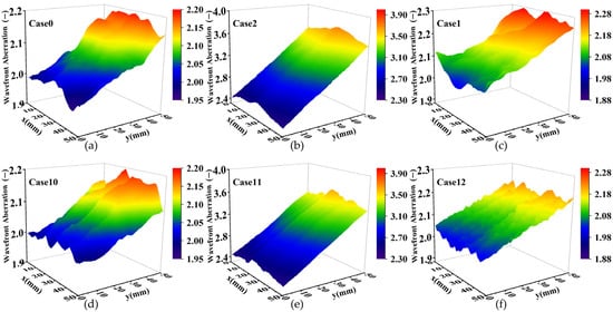When investigating higher Mach numbers’ impact on wavefront distortion with added MVGs, it was found that the aforementioned “gully” phenomenon occurs due to their inclusion—resulting in waveform distortions seen under Case12 (Ma = 5, without jet, with MVGs) conditions. As Ma increases, relative to the results obtained under Case1 (Ma = 5, without jet, without MVGs) conditions, there is approximately a 21.7% decrease observed at peak distortions.