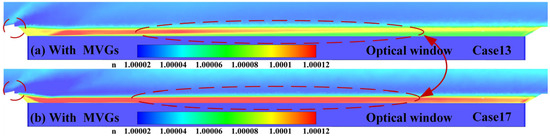 Comparison of optical window temperature distribution under Ma = 3 without jet cooling: (a) without MVGs, (b) with MVGs.