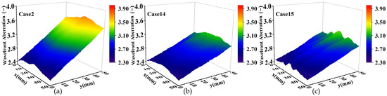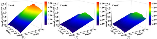 Comparison of optical wavefront aberration at Ma = 3, flow jet = 0.05 kg/s, θ = 15°: (a) without MVGs, without suction; (b) without MVGs, with suction; (c) with MVGs, with suction.
