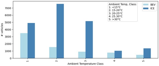 The data were divided into ambient temperature ranges, with a total of 8053 vehicles analyzed at temperatures under 15 °C, 8716 at 15–20 °C, 6020 at 20–25 °C, 1806 at 20–25 °C, and 1799 vehicles at ambient temperatures above 30 °C (see Figure 2).
