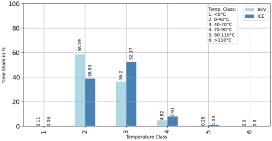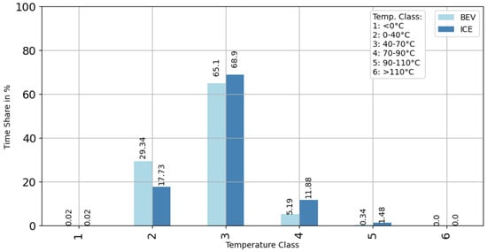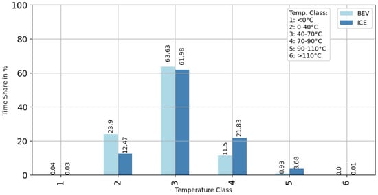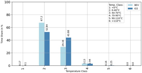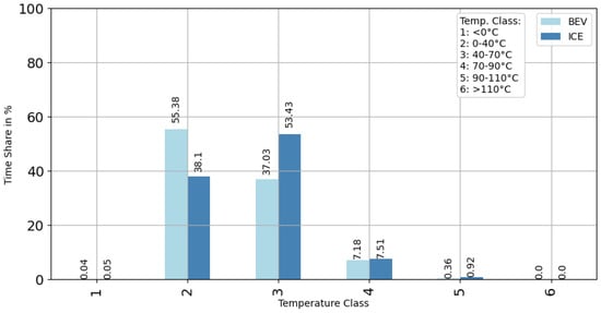 In order to obtain a meaningful and comparable overview of the temperature histogram distribution of the BEV and ICE vehicles, the time in seconds within a temperature class for all vehicles was converted into a percentage time share, and this was averaged for all vehicles in each temperature class. This was conducted so that the sum of the time shares of the six temperature classes resulted in a share of 100%.