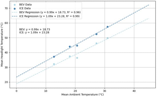 The statistical analysis using a mixed linear model revealed significant differences between the temperature classes and the importance of the interaction between engine type and ambient temperature class. The three-way interaction suggests that ambient temperatures have a modulating effect on the relationship between engine type and headlamp temperature. However, the lack of convergence of the model indicates that further research is needed to gain a full understanding of the underlying dynamics. The regression analysis shows a linear relationship between ambient temperature and headlamp temperature, which is important for the development of cooling systems and thermal management strategies. The lower temperatures in BEVs could lead to a reduction in the thermal load requirements of headlamp components, which could have a positive impact on weight, range, and cost.