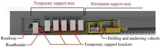 Currently, the lack of effective temporary support is the primary obstacle to the development of roadway boring speed, preventing simultaneous excavation and support operations [6,7]. To address the issue of perimeter rock damage in deep roadways, the conventional operating method involves alternating between excavation and anchor support. However, this approach does not allow for a highly efficient parallel operation of the tunneling machine and support system, with support activities accounting for 70% of the overall cycle process [8]. Consequently, the excavation efficiency is significantly hampered, leading to frequent start–stop of the boring machine and increased demand for personnel, thereby impeding the progress towards underground intelligence and automation while compromising equipment and worker safety.
