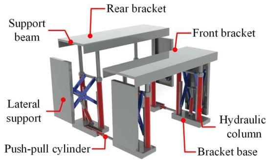 The twin-link multiple sets of stepping temporary support units consist of front and rear four-column hydraulic support units. These units include twin-link configurations, where two individual supports are connected as one group using shifting devices. The system also incorporates multiple sets of support units, allowing for the coverage of the temporary support area based on the required length of support. The stepping feature enables self-movement driven by hydraulic push–pull devices. Shifting cylinders connect the two hydraulic support units, enabling automatic shifting during the temporary support process. The twin-link multiple sets of stepping temporary support offer excellent stability and slip resistance, capable of fulfilling operational demands in roadways inclined up to 15 degrees. The design and structure of the twin-link stepping temporary support bracket are illustrated in Figure 2.