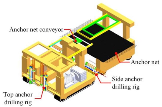 The drilling and anchoring vehicle is a tracked construction vehicle with a double-row four-arm drilling system, as shown in Figure 3. The system consists of a mesh laying unit and a drilling and anchoring unit. The mesh laying unit is responsible for laying anchor nets on the exposed coal-rock surface in front of the temporary support units, forming a preliminary anchor support.