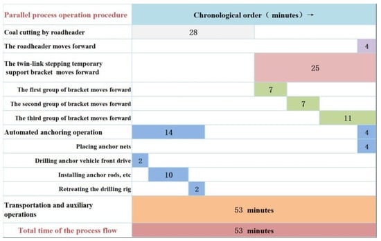 (3) Permanent anchoring: The drilling and anchoring vehicle performs the anchor protection process, involving automated drilling of anchor holes in the roof beam and side supports, filling them with anchor adhesive, installing anchor rods, and securing anchor cables. The chronological order of the steps within the operation process is presented in Figure 4.