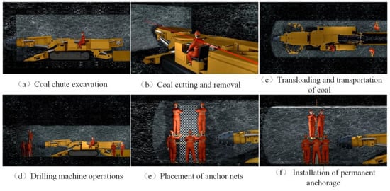Due to the complex conditions in underground operations, a significant portion of comprehensive excavation tunnel construction currently depends heavily on manual labor for serial operations. The process primarily comprises six key steps: mobilization of excavation, cutting and removal of coal, loading and transportation of coal, installation of anchor nets, and pre-tensioning of anchor rods. The schematic diagram illustrating the traditional serial operations for comprehensive excavation roadways can be seen in Figure 5.
