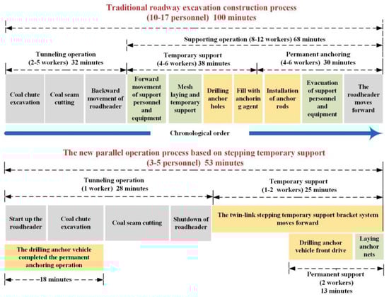 This paper presents a twin-link stepping temporary support process for underground coal mine excavation roadways and develops a comprehensive set of twin-link stepping temporary support equipment, enabling simultaneous operations of drivage, support, and anchoring in underground coal mines. A comparison was conducted to evaluate the temporal and spatial advantages of the new operation process in contrast to the traditional excavation process. The new process has demonstrated the potential to reduce the duration of a single excavation cycle by nearly 50%.