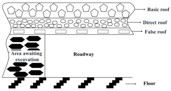Generally, rock layers are present above the coal seam within the roadway. These rock layers possess different properties and thicknesses, which significantly impact the stability of the roof formed by these layers. The roadway roof is categorized into three sections: the basic roof, the direct roof, and the false roof [16]. The composition of the surrounding rock structure in the roadway is illustrated in Figure 7.