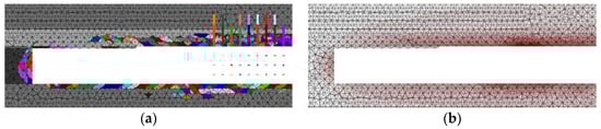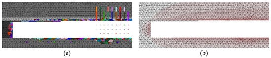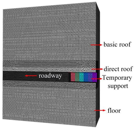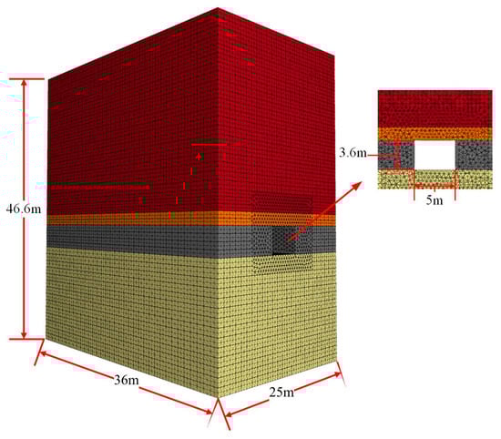 The numerical modeling of the advancing face was conducted using the Bonded Block Model (BBM) method with the 3DEC software. This approach involved simulating the surrounding rock through a collection of bonded tetrahedral elements, enabling the analysis of various processes, including fissure development, fragmentation, as well as stress and strain dynamics [20,21]. The geological numerical model of the coalfield has dimensions of 36 m × 25 m × 46.6 m, with a rectangular tunnel section measuring 5.0 m in width and 3.6 m in height. Considering the stepping temporary support mechanism, the influence of the support system on the roadway bottom is minimal. Consequently, the established numerical model directly merges the floor with the basic floor to form the roadway bottom. The roadway roof comprises the direct roof and the basic roof, with a coal seam thickness of 5 m. The direct roof is positioned above the excavated coal seam, while the upper part of the direct roof represents the basic roof. Coulomb sliding is employed to model the contact types between internal constitutive blocks within rock formations and between distinct rock formations in numerical simulations. The numerical model is visually depicted in Figure 8.