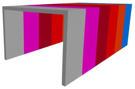 The excavation process in the numerical simulation involves stepwise excavation of the roadway and stepwise support, with each step being 1.6 m. Following each step of roadway excavation, the original rock stress is applied to the surrounding rock of the excavation face and gradually reduced to mimic the process of stress release in the field after excavation. The stress release is represented by a power exponential equation, with a rapid initial release followed by a slower release in later stages. Temporary bracing is implemented when the released stress reaches 70% of the original rock stress after each excavation step, to provide support to the surrounding rock. For the first six excavation steps, a monolithic brace is added at each step. Upon completion of these initial six steps, the numerical model forms a complete temporary support area for the roadway. The coupled model of the first six excavation steps and the temporary support is depicted in Figure 10.