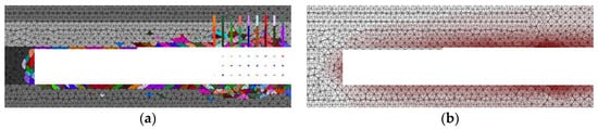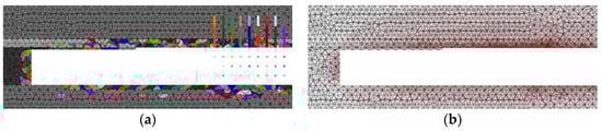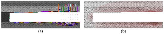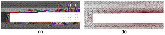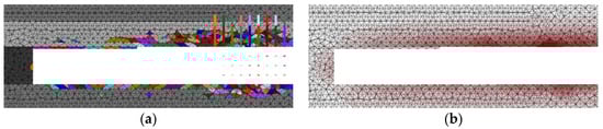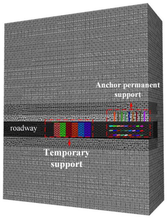 In the subsequent excavation sequence, a sequential movement of six monolithic braces in the excavation direction is employed for each excavation step, simulating a stepping repetitive support process for the roof slab. This results in the formation of an empty roof zone after the forward movement of the 6th brace. Once the stress in the hollow roof area is released to 30% of the original rock stress, the permanent support of anchor rods and anchor cables begins. The anchor rods and anchor cables were simulated using the Cable structural unit integrated in 3DEC software. The anchor rod has a diameter of 22 mm and a length of 2.4 m, while the anchor cable has a diameter of 17.8 mm and a length of 6 m. The spacing between the roof anchor rods is 1 m, with six rods per row and a spacing of 0.9 m. All anchor rods are arranged vertically against the roof. The spacing between the two wall anchor rods is 1 m, with four rods per row and a spacing of 1.1 m. They are all arranged vertically against the walls. The spacing between the roof anchor cables is 1.8 m, with a row spacing of 2 m. All of them are arranged vertically against the roof of the roadway.