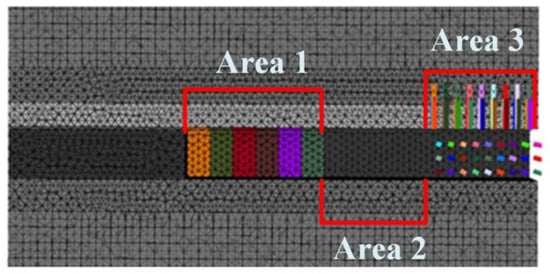 Following the completion of step-by-step excavation and support, the calculations continue until stress equilibrium is achieved. Figure 13 presents a schematic diagram illustrating the distribution of the excavation roadway area after the temporary support is finalized. Area 1 represents the temporary support area, Area 2 refers to the region after repeated support, and Area 3 corresponds to the permanent support zone.