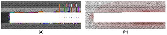 During the excavation, support, and anchoring equipment processes, the cantilever shearer has a length of approximately 8–10 m, and each set of twin-link temporary support units has a width of 3.2 m. Therefore, three sets of twin-link temporary support units are used to form a temporary support zone above the shearer, creating a tunnel temporary support area. A support model is established in the 3DEC software as depicted in Figure 9. Due to constraints in the numerical modeling of the support system, only the framework structure of the supports is retained, and transitional devices that do not impact the roof are removed. Considering the absence of crushing or similar occurrences in the normal operating condition of the support, as well as the metal being in the elastic phase, the support is presumed to be rigid, while the surrounding rock is considered a deformable body that has not yet met the Mohr–Coulomb criterion. Consequently, elastic contact is established between the support and the surrounding rock.