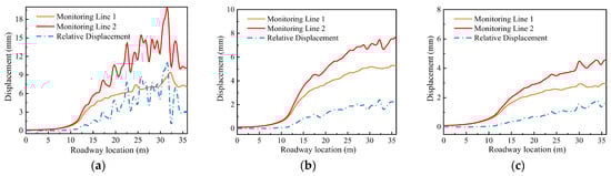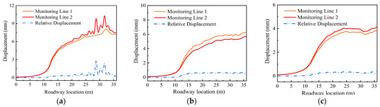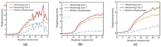 Based on Figure 19 and Figure 20, it is observed that for direct roofs with thicknesses of 1.6 m and 2.4 m, the maximum extent of crushing spans a range of 0.8–1 m. The respective maximum displacements on the surface of the direct roof amount to 32 mm and 35 mm. When temporary support and permanent support work in conjunction, as depicted in Figure 21b,c, the maximum relative displacement along the two displacement monitoring lines at the interface between the direct roof and the basic roof remains below 2 mm. This observation falls within the acceptable range for the direct roof to remain stable and securely attached to the layer.